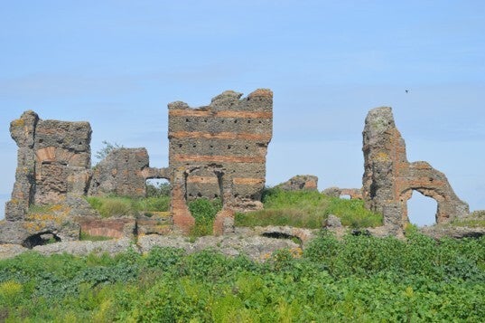 Nel decennio successivo, tra il 140 e il 150 d.C. , venne infine costruito il Gruppo C caratterizzato dall’uso di un raro esempio dell’opera vittata con paramento di blocchetti di tufo alternato a fascioni di laterizi. Il settore è occupato da una fitta articolazione di sale tra le quali è stato riconosciuto un impianto termale. Nell’ambiente centrale dice Ashby che secondo lui era il frigidarium, dotato di una vasca a cielo aperto circondata da portico pavimentato in mosaico bianco. L’ambiente 2, coperto da una volta a crociera, aveva i tubuli alle pareti, ritrovati poi anche nell’ambiente 3. L’edificio poggiava su di un complesso sistema di sostruzioni che colmavano il dislivello fra il piano inferiore e la grande terrazza giardino.
